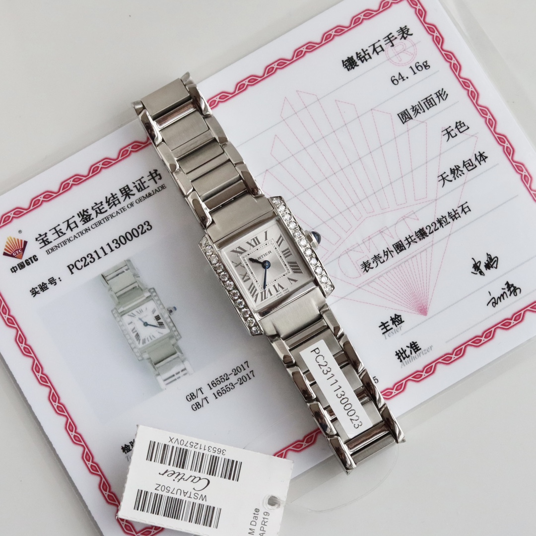 latest 推出2023年全网 latest 第2代TANK Francaise France Tank Real Diamond Women watches ! Case 镶嵌22颗2.1超大 diamond 约0.7 gram 拉,配国检机构检测证书!一物一证一表一码。 dial 尺寸 small 25.7*21.2mm。 “一体手镯式”作为TANK series 的核心元素,第2代对 Case 、表冠、表链、 dial 设计细节均进行改进,整体 style 更加现代!新作 Case 和表链均采用进口316F stainless steel 打造。 movement 采用瑞士进口 quartz movement movement 。 Case 尺寸比旧款略微增加,表链链节比例也经过重新设计,均采用大面积的拉丝缎面工艺, Case 和表链浑然一体,极其连贯的线条, elegant 利落!一体式链带的链节采用“半跌式设计”非常柔软灵活且环环相扣,可以 Perfect 的贴合不同佩戴者的腕部! 平行表耳 collocation 弧形 Case ,末端稍加圆角处理更显圆润柔和。新作的巧妙和用心之处还在于:在 Case 给表冠处挖出一个凹槽,让表冠可以半埋在壳中,形成一个表冠的护肩,这样既可以减轻表冠顶手问题也让视觉效果更为简约洗练! dial 采用 Silver 白拉丝工艺,时标和分钟刻度均增加凹雕线条。新作比旧作 upgrade 了立体金属时标,配以粹火烧钢 blue 针,在高穿透 France Sapphire 镜面映照下更加充满层次感和现代感!