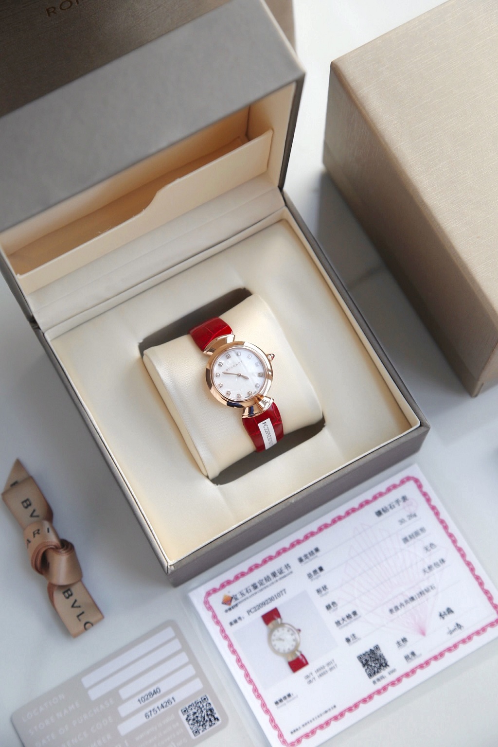 BulgariDIVAS' DREAM watches 102840,102841DVP30W9GL/12 Real Diamond Women watch黑色 dial 与 classic 别致的扇形图案相 Fusion ,展现现代 lady 性多面的风采。DIVAS' DREAM watches 从 lady 性的 elegant 气质和永恒之城的迷人气息中汲取灵感,以独树一帜的罗马精神向最迷人的 lady 性致敬。这款珠宝 watches 极具 lady 性气质、精美雅致,呈现卡拉卡拉大浴场大理石的色彩和扇形马赛 gram 的迷人曲线,体现意大利美学的 real 正精髓。 quartz movement movement 。30 mm 18K Rose gold Case 。18K Rose gold 表冠,镶嵌一颗蛋面形切割粉红碧玺。18K Platinum 链节。黑色漆面 dial ,配以 diamond 时标。黑色鳄鱼皮 watch strap , collocation 18K Rose gold 针扣。