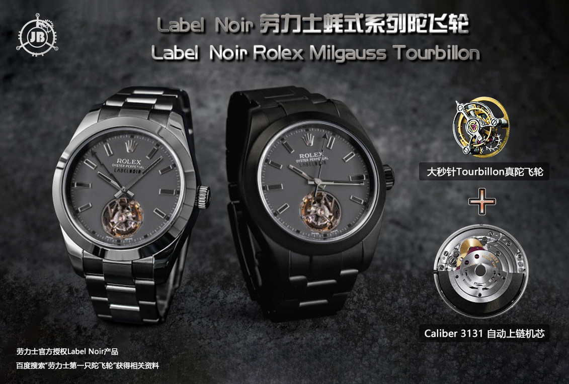 JBRolexLabel Noir蚝式 Tourbillon ,第一枚外媒认可的带 Tourbillon 的Rolex watches ,JB Factory 和Label Noir官方一样基于Milgauss蚝式116400闪电针的数据进行开发,制表师在3131 automatic mechanical movement movement 的基础上进行了深度开发,拆除了51个组件,然后增加了94个新组件,并对2枚组件进行了 modified ,搭载第一枚大秒海鸥 Tourbillon movement ,也是clone界又一次技术突破。最终的结果是拥有了世界上第一只Rolex real Tourbillon watches 暨第一只带 Large second hand Tourbillon 。 stainless steel Case 进行了黑色PVD, dial 被改为哑光 Gray 色,指针和时标同样为黑色,和Rolex蚝式一样的折叠表扣——总而言之,蚝式鲜亮的字面被替换为低调高档的深色,让你的注意力集中在6点的 Tourbillon 上。12点的「Milgauss」铭文被修改为「Label Noir」。劳粉可以百度搜索“世界上第一枚带 Tourbillon 的Rolex”获得相关资料。官方源视频https://v.qq.com/txp/iframe/player.html?vid=j13483ka3me,这样呕心沥血打造的一款极品Rolex,不但佩戴起来帅气有逼格,而且可玩度非常高,值得收入囊中。JB FACTORY在罗杰杜比RD双 Tourbillon 和Richard Miller RM Tourbillon 后又一神作,JB Factory -专为TOP Tourbillon 而生。